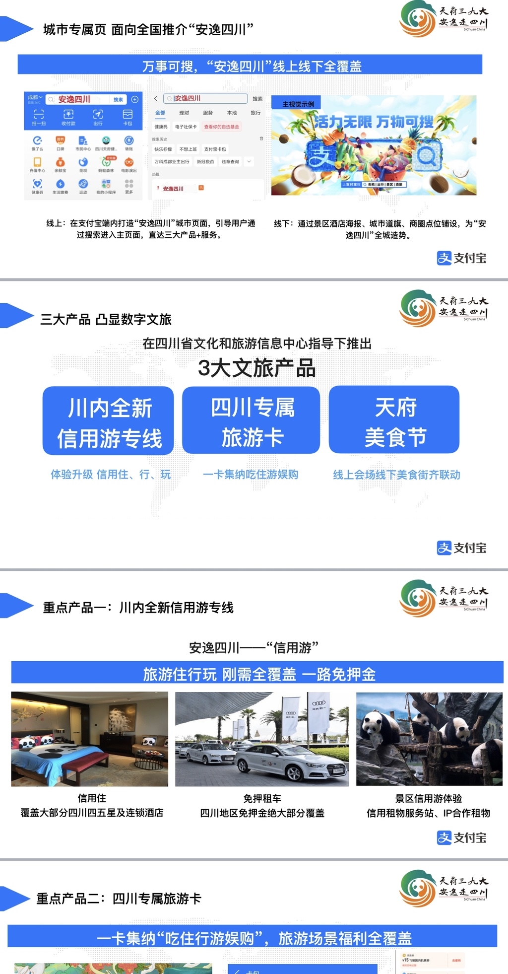 该系列活动包括推出省内多条信用游线路线、四川专属的旅游卡、盛大的天府美食节等主题活动。活动期间,支付宝将在端内重要位置开设专区,集纳上述三大产品,全面呈现四川“吃、住、行、游、娱、购”等数字文旅场景,为游客提供多项便捷的数字化服务,更好的提升游客在川线上线下体验感,不断擦亮四川文旅品牌形象。