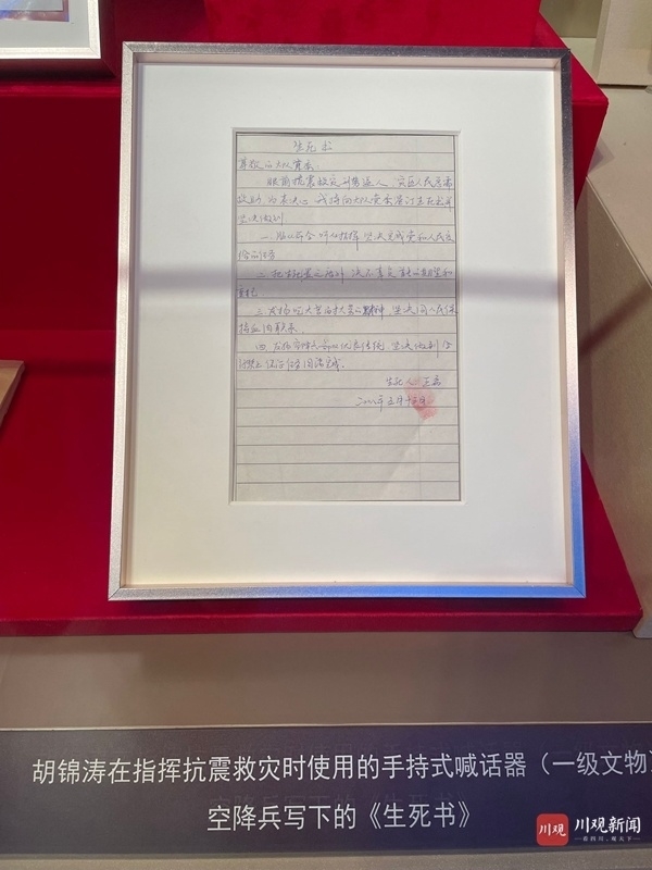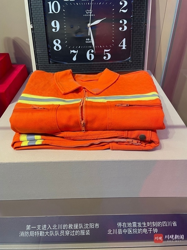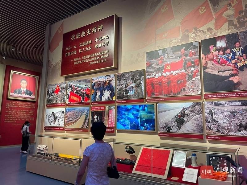 展览中,抗震救灾精神板块有许多感人的展品出自四川。其中,5·12汶川特大地震抗震救灾的部分照片和实物,有抗震救灾大型募捐晚会使用的赈灾捐款箱、第一支进入北川的救援队队员穿过的服装、抗震救灾歌曲《生死不离》的手稿等。