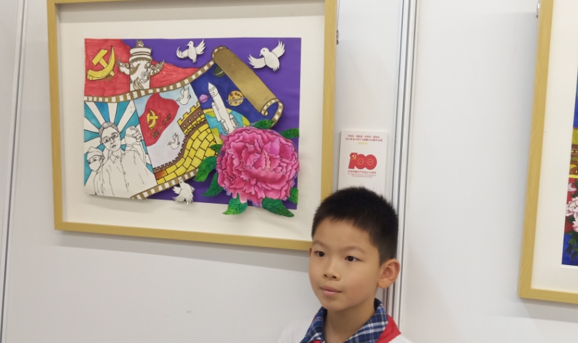 一位小朋友主动要求在这幅作品前留影,因为“它不完全是画出来的,还用了很多剪纸的方法。我喜欢它。”。
