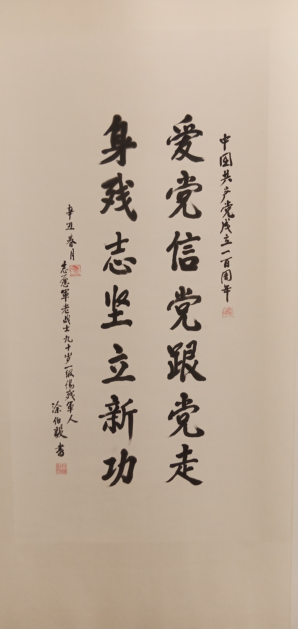 另两幅分别是一级英模周全弟、涂伯毅的书法作品(您能想象,两位高度伤残的军人,是如何写出如此有力的大字吗?)
