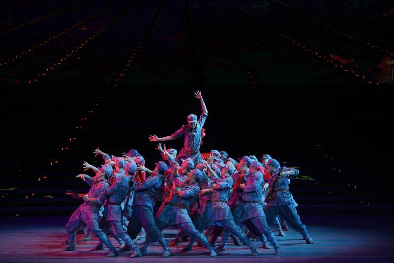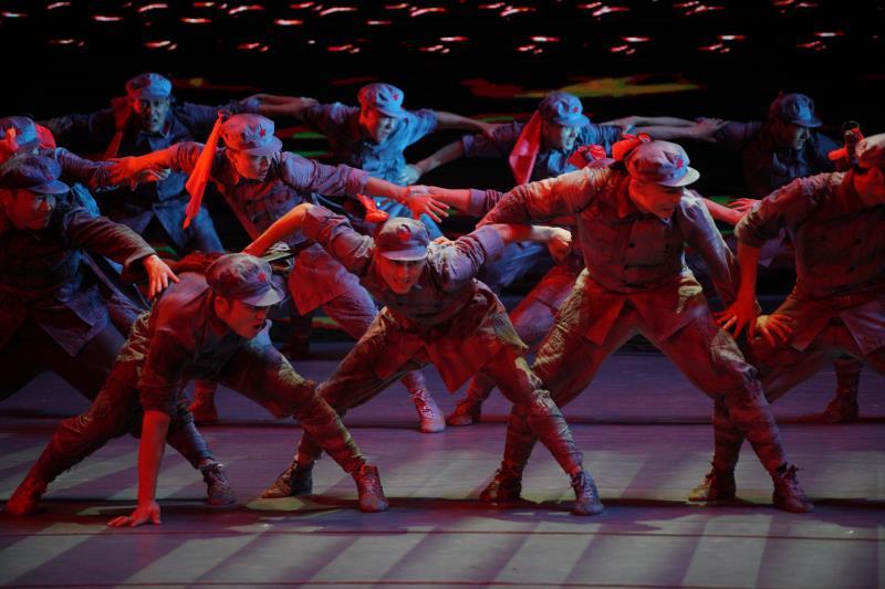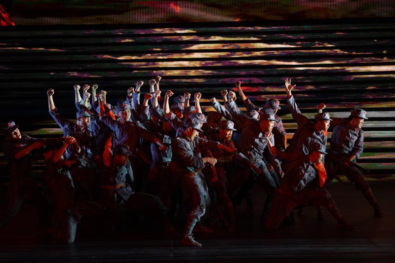 急促铿锵的节奏声里,一群战士奔涌而来,无畏向前的视觉冲击立即席卷在空间。舞台背景上,摇晃的铁索横贯江面。惊涛骇浪间,红军战士迎着枪林弹雨,手扶铁索,一边举枪射击,一边匍匐前进,紧张激烈气氛溢出舞台,牵动观众的心。在这段舞蹈节目《飞夺泸定桥》里,不论士兵的表情、动势,还是舞台背景、音乐的烘托、铺展,都凝结的英雄气概和无畏精神,生出一股直指人心的力量。