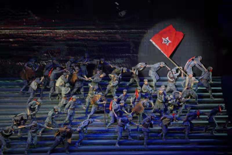随着音乐的淡入,视角又转向了长征途中。风雪呼啸,相互偎依的红军战士身影出现在茫茫的雪上草地中。在这个情景舞蹈节目《过雪山草地》,高举的旗帜像是不灭的明灯,指引着人们向前。