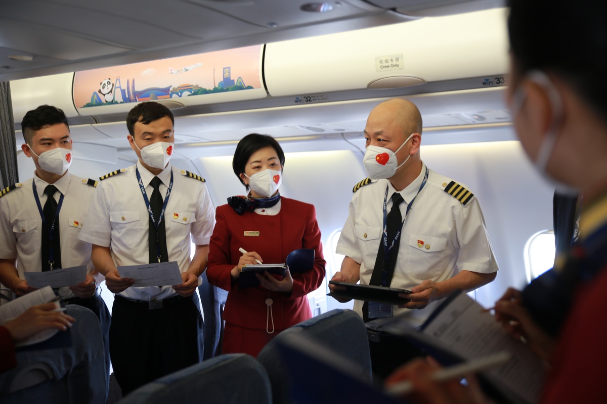 保障首航,国航飞行总队、西南分公司选派政治过硬、技术过硬,拥有丰富飞行经验的资深机长组成首航机组。机组成员在前期开展了模拟机训练等严谨细致的首航准备工作,在天府国际机场的模拟视景上开展24个小时的模拟飞行,熟悉掌握飞行程序、机场周边地理特点等。同时,从管理干部、客舱乘务检查员、全国青年文明号乘务组中选派业务精湛的乘务人员,参与到此次首航保障任务中,并对首航乘务组进行了专包机业务培训。
