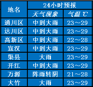 今天晚上到明天白天,受低空切变影响,达州北部阵雨转阴,中南部中到大雨、局地暴雨;最低温度:21~23℃,最高温度:28~29℃。