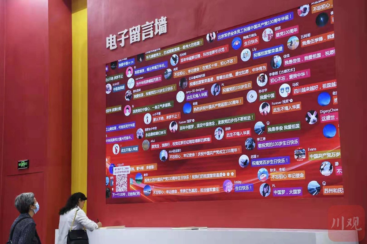 6月26日,“壮丽史诗 伟大飞跃”——四川省庆祝中国共产党成立100周年主题展览在成都世纪城会展中心揭幕,参展观众纷纷以个人或公司名义在留言本和电子留言墙写下了观展感受。扫描左下角的二维码,手机上就弹出一个留言框,点击发送,留言就上传到电子大屏并滚动播放。