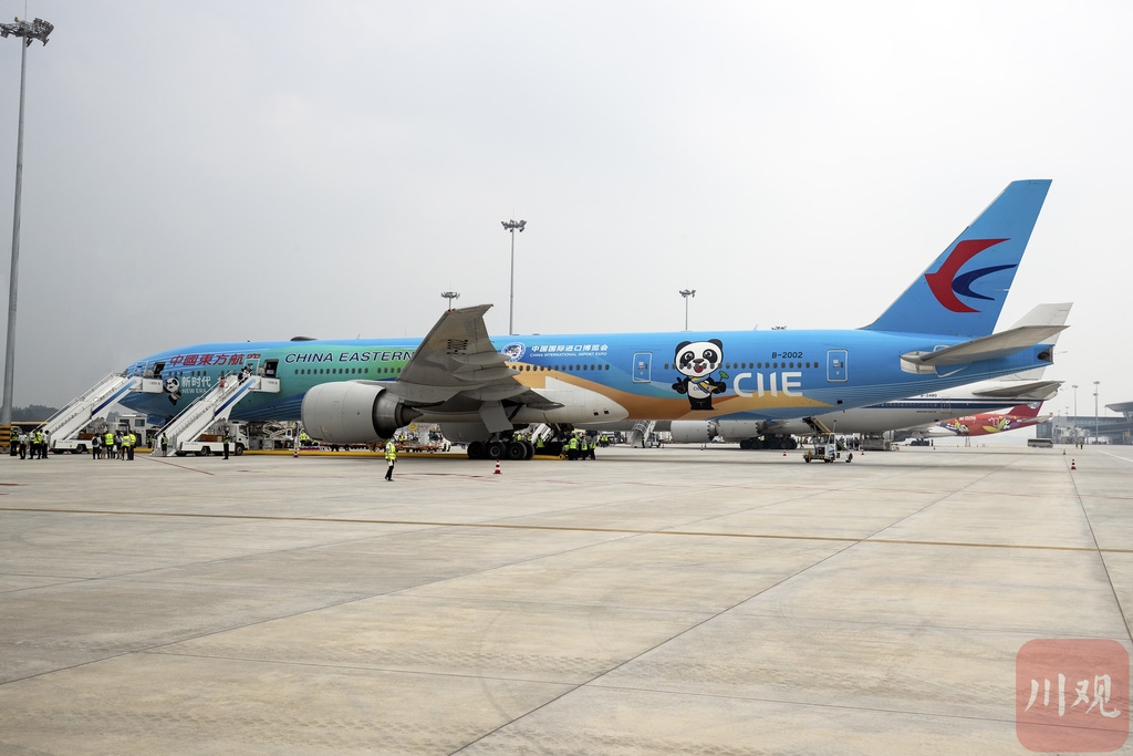 当天11时15分,东航全球首架“进博号”彩绘飞机、喷绘熊猫“进宝”的B777-300ER飞机滑向跑道、腾空而起、直上云霄,其执飞的MU5416航班,搭乘310多名旅客,成为成都天府机场飞往上海的全民航首班。同一天,还有一架涂着东航凌燕航徽、有着“墨镜侠”之称并搭载着全球最先进客舱服务系统的A350-900客机于12时从天府机场起飞,执行MU9697航班,搭乘280余名旅客飞往北京大兴国际机场,开启“新天府”首航“新国门”的精彩旅程。