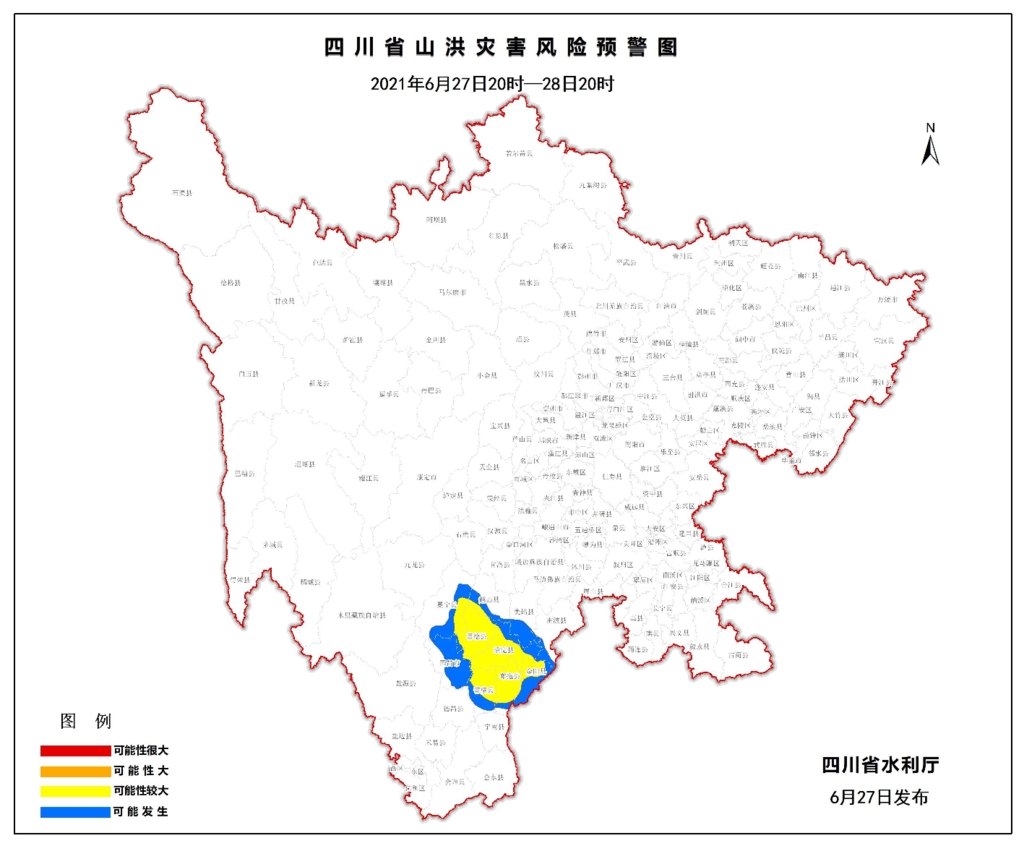 6月27日18时,四川省水利厅发布山洪灾害黄色预警,27日20时至28日20时,冕宁、越西、喜德、昭觉、金阳、布拖、普格等县(市、区)发生山洪灾害可能性较大(黄色);美姑、雷波、西昌等县(市、区)可能发生山洪灾害(蓝色)。据悉,这是我省今年入汛后发布的首个山洪灾害黄色预警。