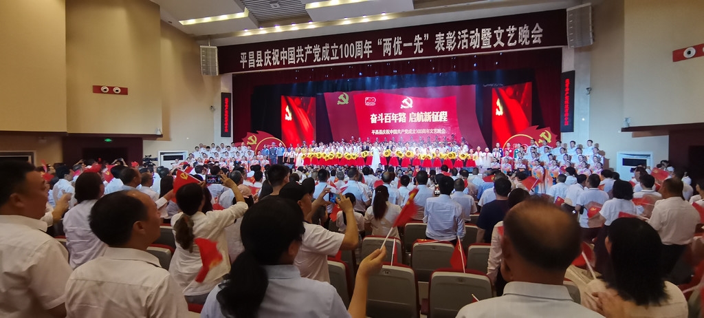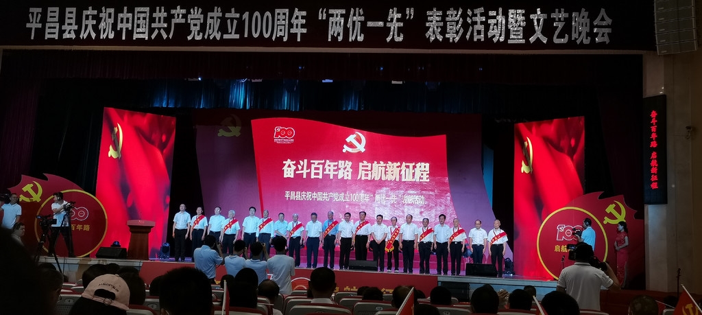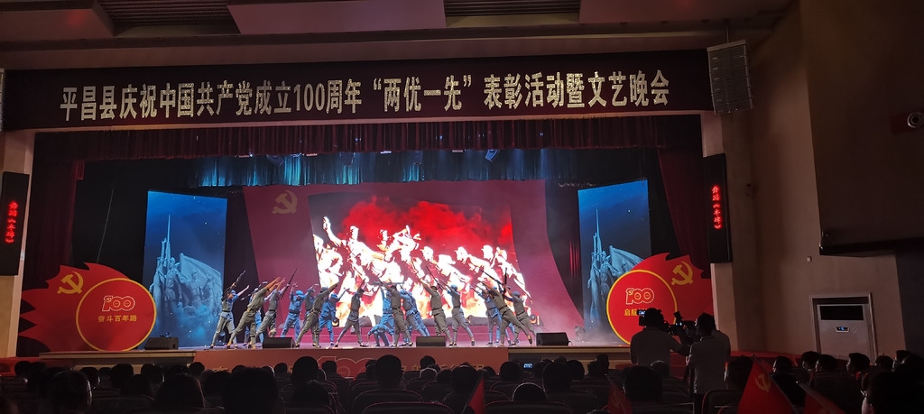 一豆灯火缓缓亮起,点亮漆黑的夜空。点点星光凝聚成数道光影,投射在大屏幕上,党徽铸成、党旗飘扬......6月27日晚,随着台上视频开启,“奋斗百年路 启航新征程——平昌县庆祝中国共产党成立100周年‘两优一先’表彰活动暨文艺晚会”在该县文体会议中心拉开序幕。