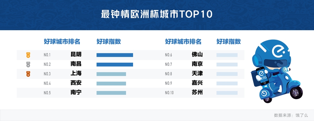 而对比赛前、赛后凌晨订单变化趋势,饿了么发现,受欧洲杯影响宵夜订单增长最显著的城市前三分别昆明、南昌和上海,这份榜单也同样可以被看作是欧洲杯球迷热情最高城市榜单。从商家热情来看,今年6月以来,饿了么平台有上万家门店推出了与“欧洲杯”相关的套餐,最为热门的套餐品类主要集中在炸鸡、烧烤、小龙虾和奶茶等。从城市分布来看,上海、深圳和苏州的商家对欧洲杯的热情最高。