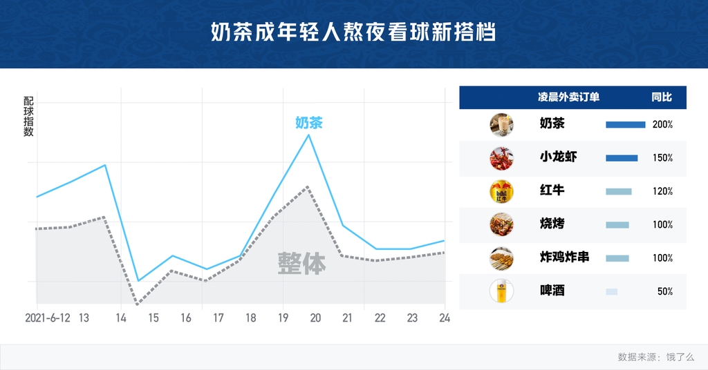 同比去年,欧洲杯以来凌晨奶茶订单量增长2倍。在上海普陀区一家24小时营业的奶茶店,欧洲杯开赛以来,凌晨的奶茶订单量环比5月同期就高出近一倍。可见奶茶正在替代传统能量饮料和酒饮,成为更多年轻人熬夜看球的第一伴侣。
