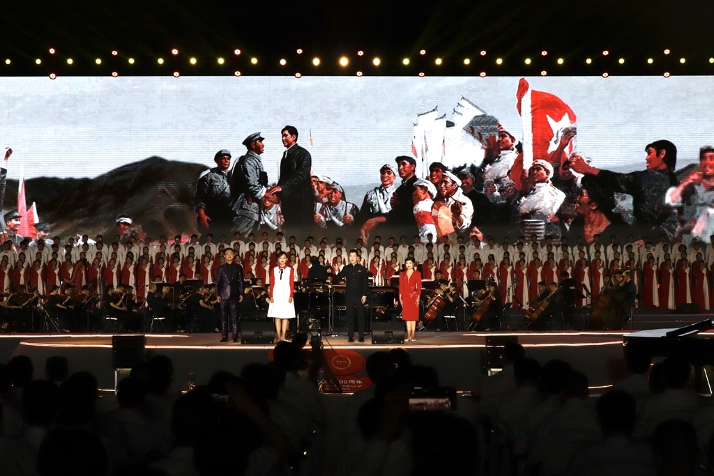 晚会进入尾声阶段,在百架钢琴伴乐中,全场齐声高唱《没有共产党就没有新中国》,对党的感恩感激和热爱赞美之情写在每个人的脸上。
