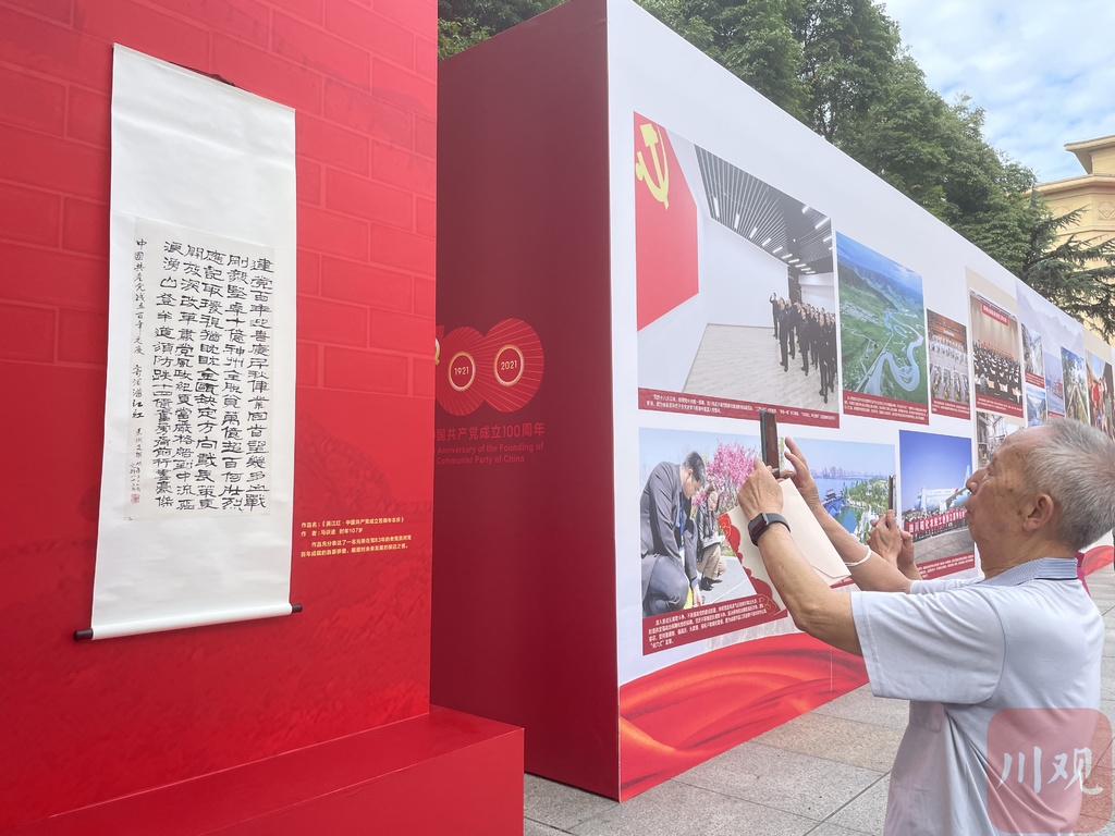 专题图片展设置在锦江大礼堂外的广场两侧,单边长42米,总长84米,高度2米,包括152张具有代表性的图片,分为“浴血奋战换新天”“艰辛探索创伟业”“伟大变革铸辉煌”“民族复兴谱新篇”四个部分。每个部分各有主题,又分别由展示板下方的一条鲜红的飘带紧紧连接。展览的一端还设置了一幅马识途老先生的书画作品,107岁的马识途书写了一首《满江红·中国共产党成立百周年志庆》,表达了一名光荣在党83年的老党员对党的百年成就的自豪骄傲,展现对未来发展的豪迈之情。