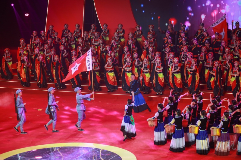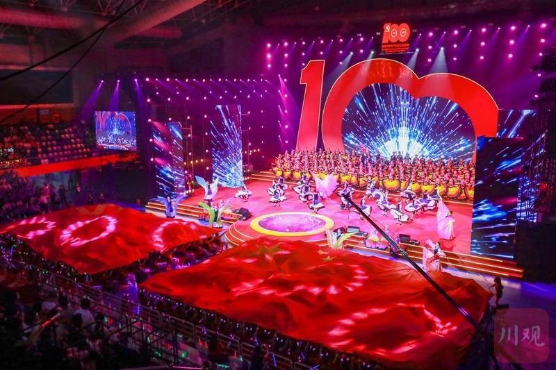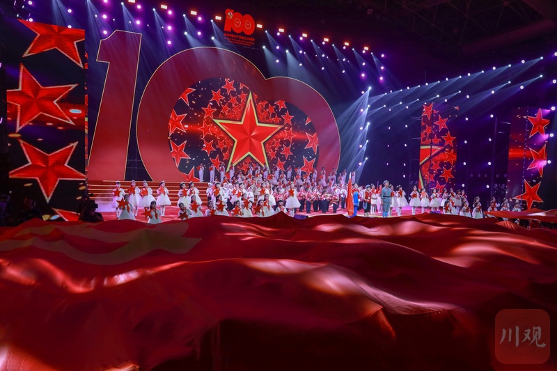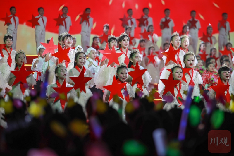 随着尾声《迈步新征程》篇章开启,伴随着雅安市百名先进优秀共产党员的表演,一首合唱《前进吧 中国共产党》激情洋溢,参演人员载歌载舞共唱红色岁月颂。演出最后,全体起立合唱《没有共产党就没有新中国》,台上台下同抒炽热赤子情,将现场氛围再次推向高潮。