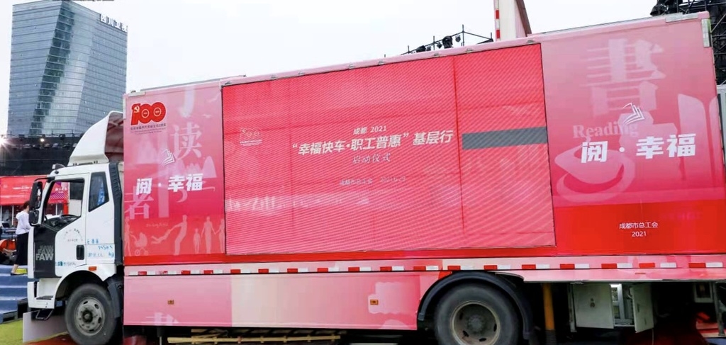 “作为成都市总工会落实‘我为群众办实事’的举措之一,我们按照成都市委关于场景营城的要求,线下采用通过对快车进行整体包装和设备组装,利用互动设备、LED大屏、多媒体音响设备、职工书屋等载体,将建党百年辉煌成就和‘幸福美好生活十大工程’的实惠带给职工群众。”成都市总工会相关负责人介绍,此次活动并非单纯的巡展,而是线上线下齐发力的场景营造。