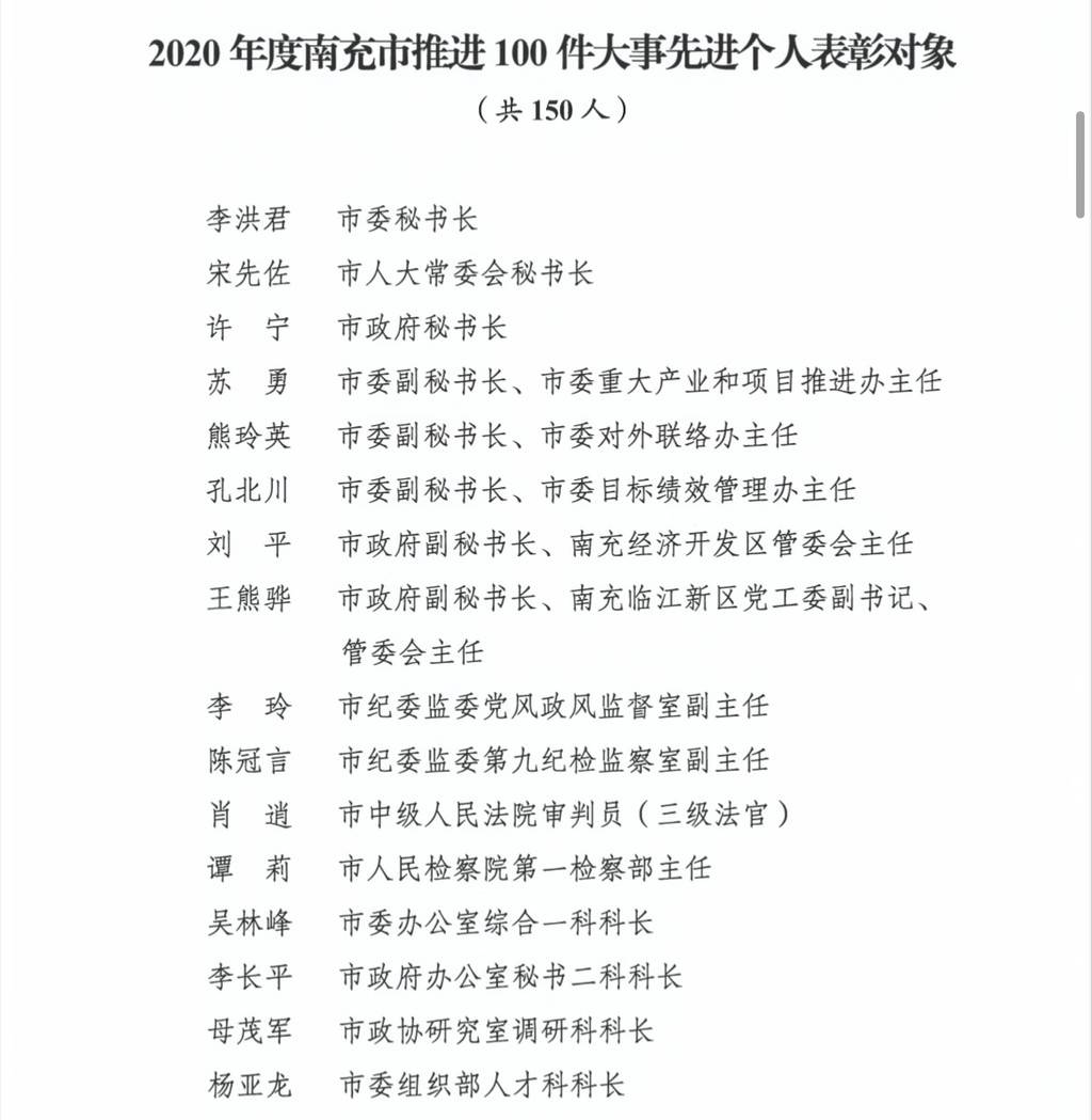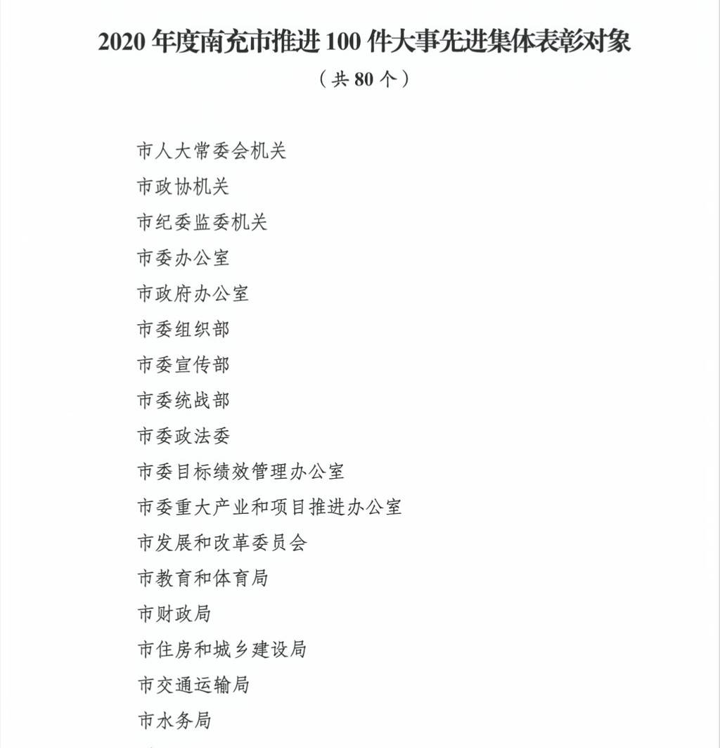 6月30日下午,南充市召开推进100件大事和“三场攻坚战”“三场突围战”表彰大会。会上,2020年度在全市推进100件大事和“三场攻坚战”“三场突围战”过程中,表现突出的南充市人大常委会机关等160个先进集体和李洪君等300名先进个人获得了表彰。据了解,今年年底,100件大事中将有82件建成完工。