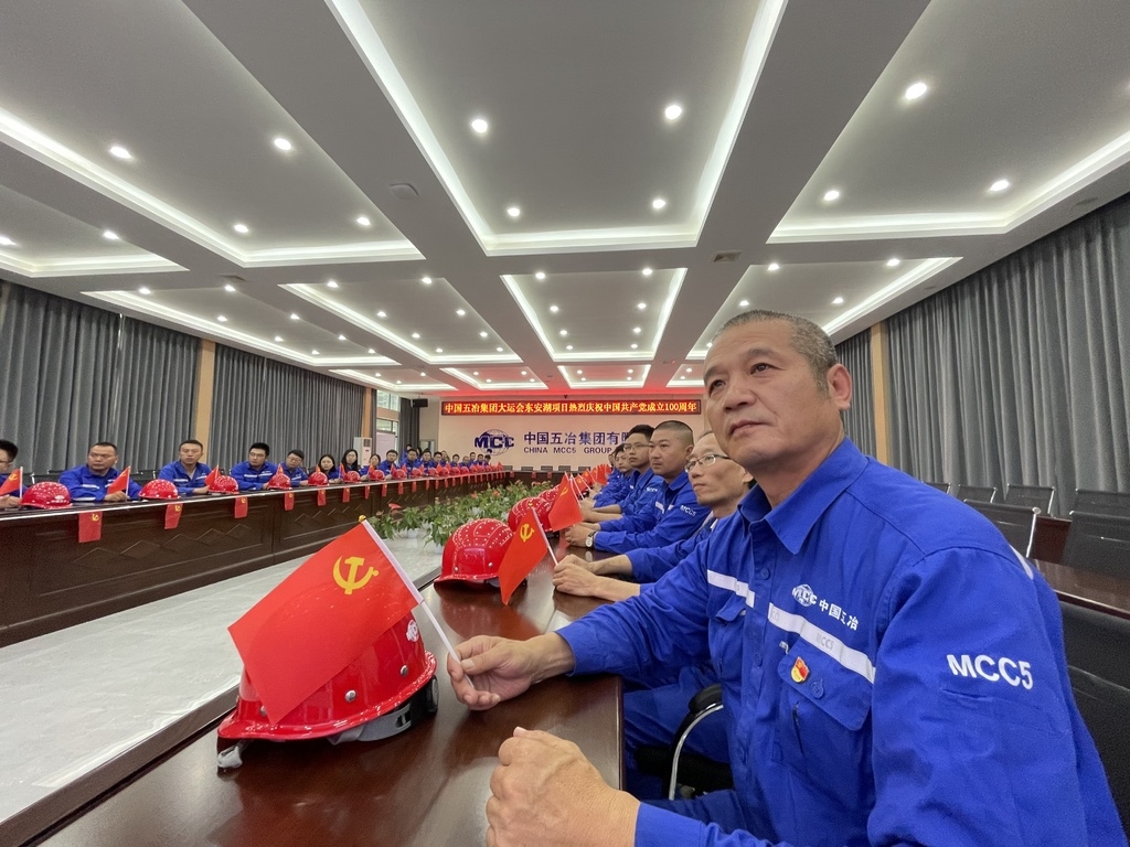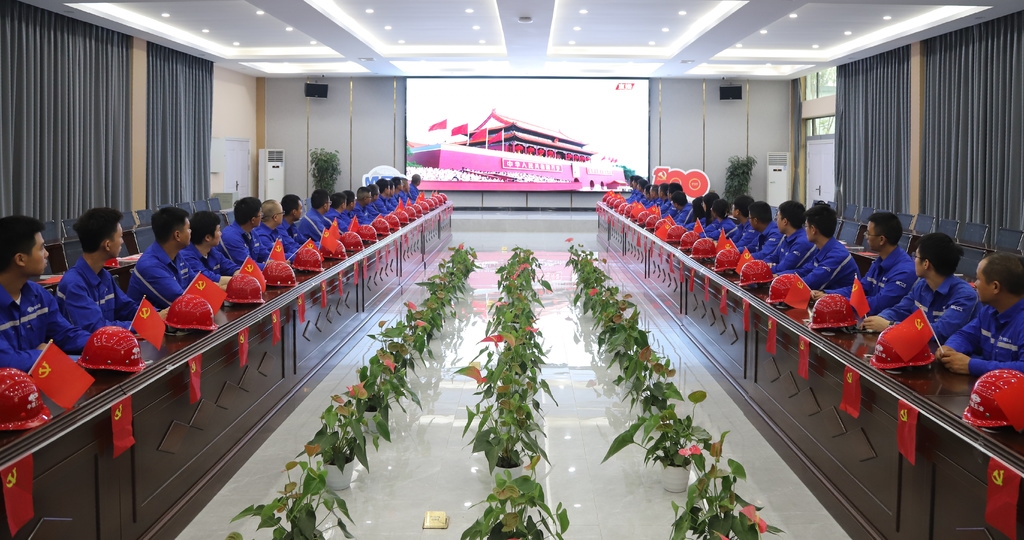 7月1日上午8时,中国五冶成都世界大运会主会场东安湖生态公园项目指挥部,大家挥舞着国旗、党旗,现场气氛热烈。项目党支部组织全体党员、入党积极分子、员工代表等近50人集体观看庆祝中国共产党成立100周年大会,聆听习近平总书记重要讲话。