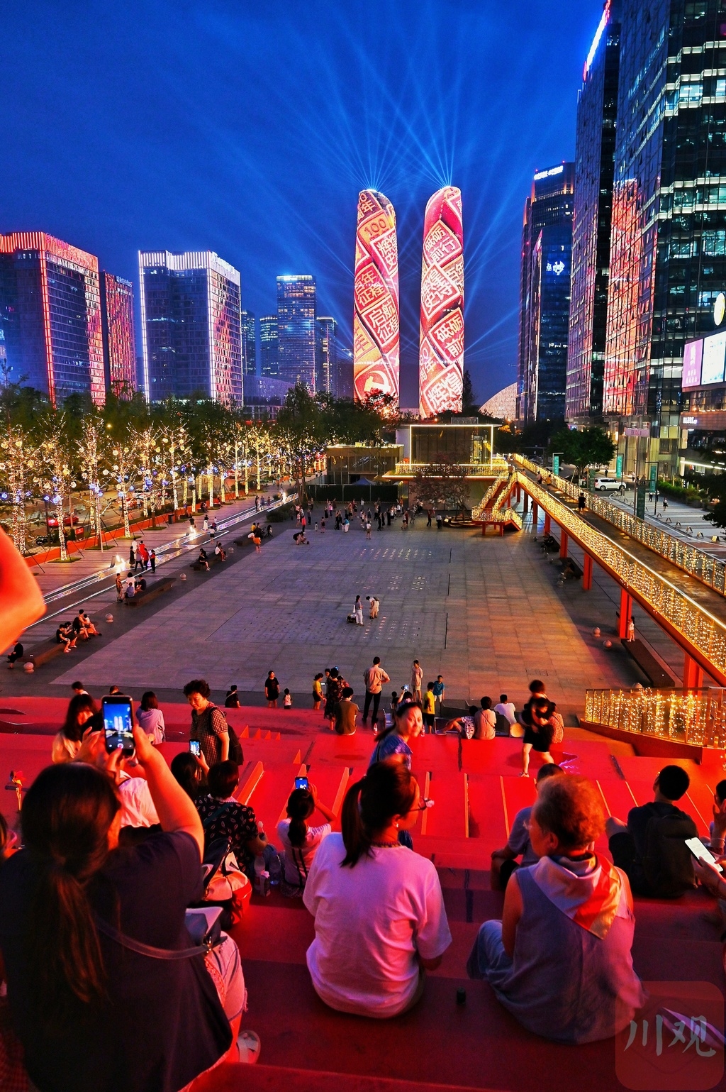 7月1日晚,成都金融城天府双塔上演了一场主题为“成都儿女心向党”的声光电一体主题灯光秀,热烈庆祝中国共产党百年华诞。