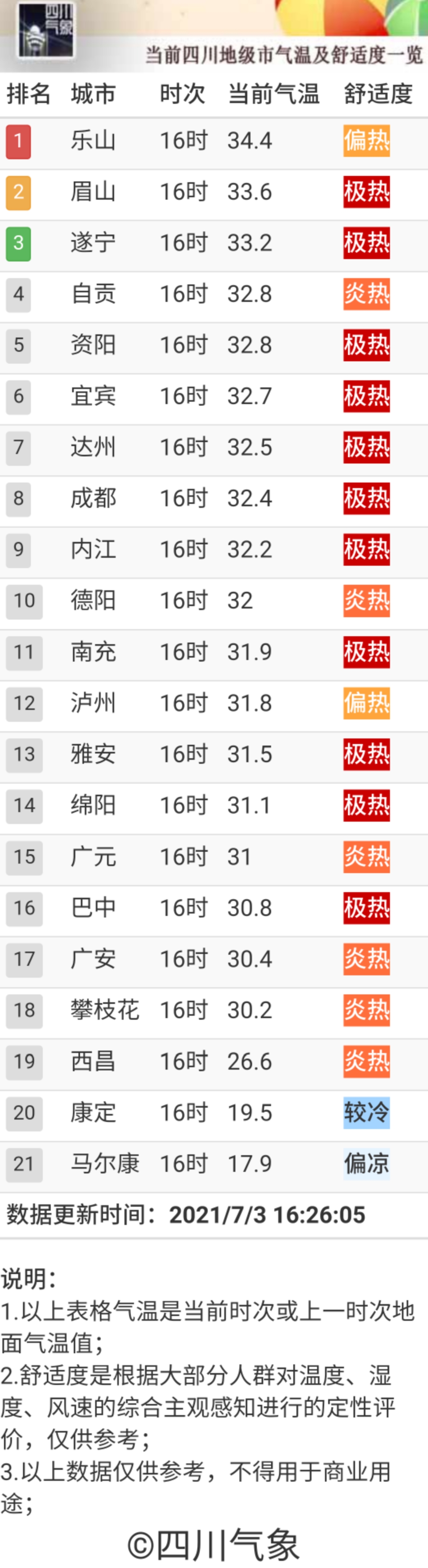 据四川省气象台,截至7月3日16时,四川各地的实况气温是这样: