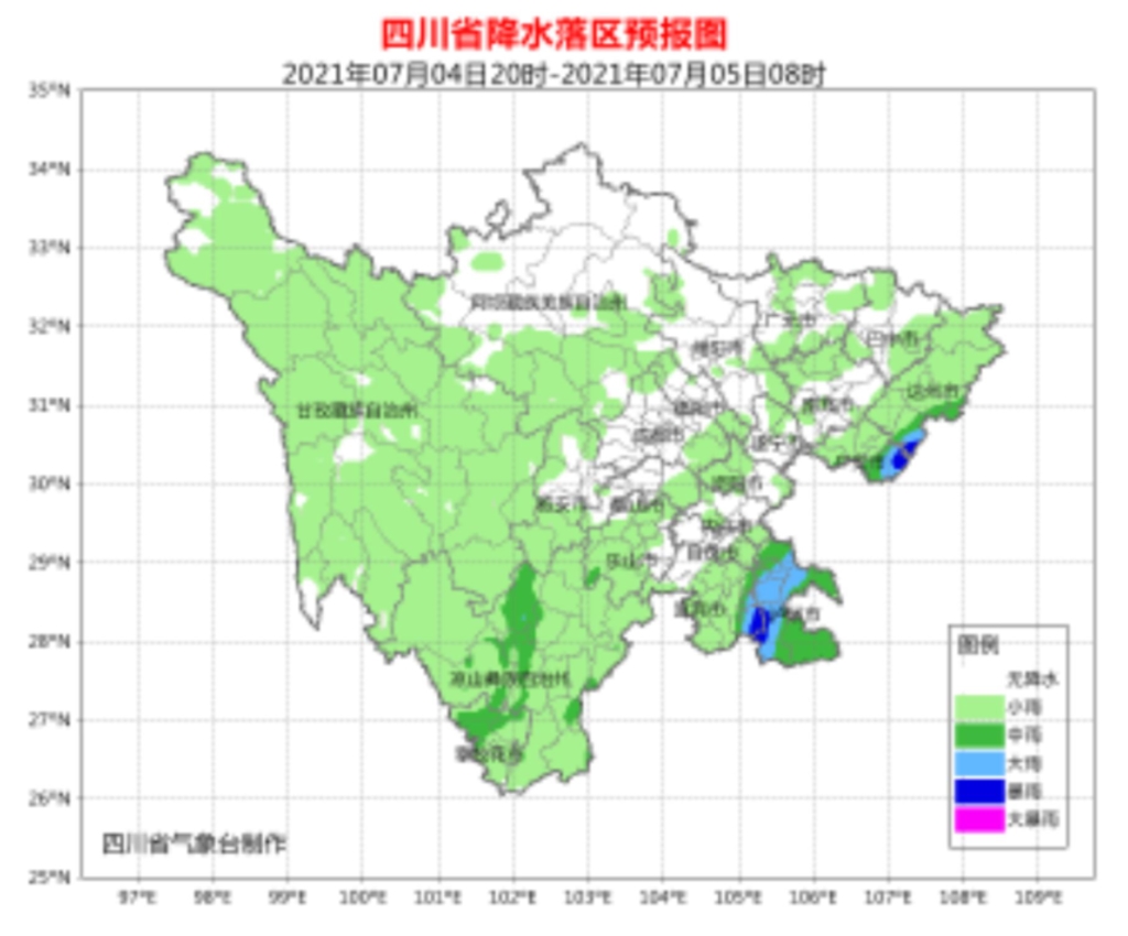 但降温必定有雨水相伴而来。四川省气象台预计,7月5日白天到晚上,盆地各市阴天间多云有阵雨或雷雨,其中达州、广安、宜宾、泸州、乐山、眉山、雅安7市和巴中、南充2市东部有中雨,局部大雨到暴雨,个别大暴雨;川西高原阴天间多云有阵雨或雷雨,局地中雨;攀西地区阴天有中到大雨,局部暴雨。