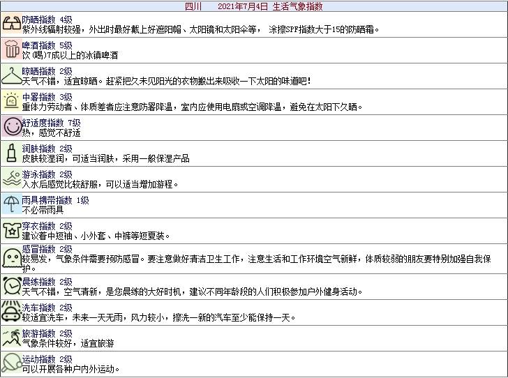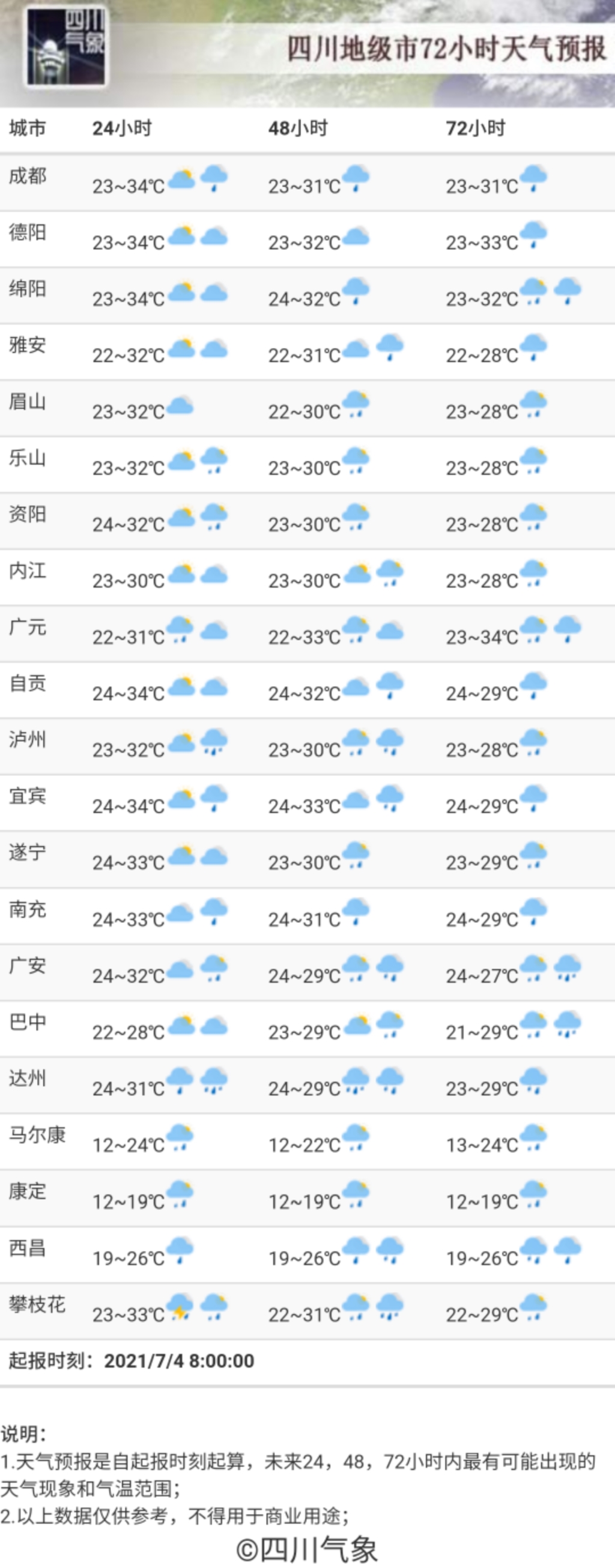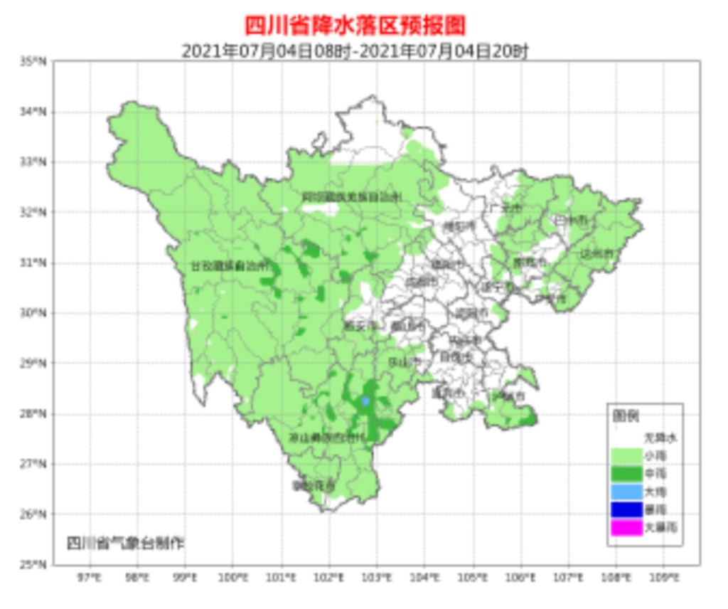 预计今天(7月4日)白天,广元、巴中、南充、达州、广安、雅安、乐山7市阴天间多云有分散阵雨或雷雨,盆地其余地方多云间晴;川西高原和攀西地区阴天间多云有阵雨或雷雨,其中,凉山州东北部的局部地方有中到大雨。