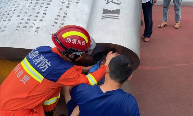 7月4日下午,自贡市大安区仁和人行天桥,一小朋友钻进一个书卷式的城市雕塑后,被卡住无法出来,家长尝试各种方法未果,随后拨打119求助,自贡119指挥中心接警后立即调派钟云山路消防救援站前往营救。