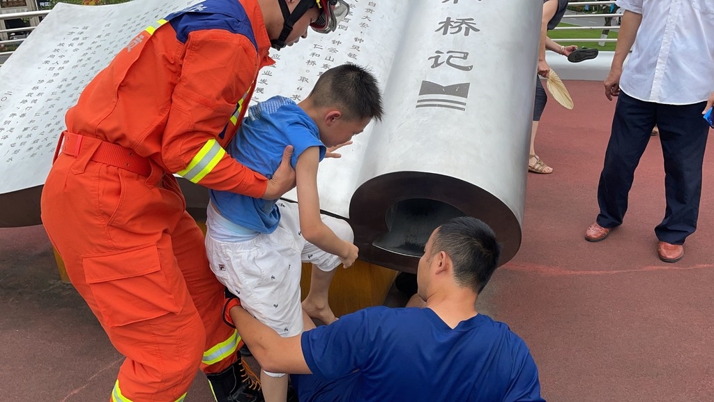 救援人员到达现场后发现,小朋友的脚横在雕塑的洞里,消防员在安抚小朋友的同时,用手小心翼翼的调整小朋友的位置,将小朋友拖拽救出,小朋友无碍,整个救援过程不到3分钟。