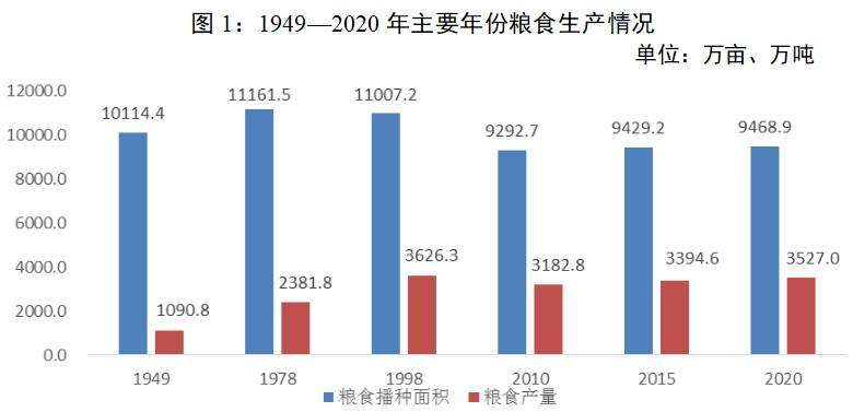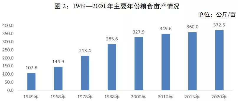 1.粮食生产能力显著提升。四川粮食播种面积总体保持在1亿亩左右;同时狠抓粮食生产政策、科技、资金投入和农业基础设施建设落实落地,广泛开展粮食优质高产创建,粮食单产水平稳步提高,确保了口粮绝对安全。2020年全省粮食播种面积为9468.9万亩,居全国第7位;粮食单产水平由1949年的107.8公斤/亩提高至2020年的372.5公斤/亩,提高了2.5倍;粮食总产量重上700亿斤(3527.4万吨)台阶,居全国第9位。