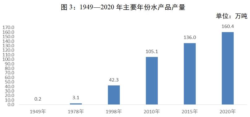 2.水产品产量快速增长。2020年全省水产品产量160.4万吨,比1949年增加160.2万吨,比1978年增加157.3万吨,年均增长9.9%。