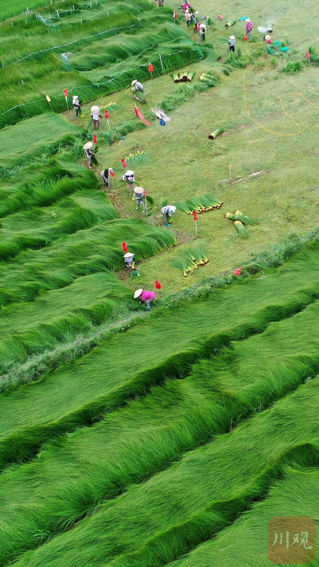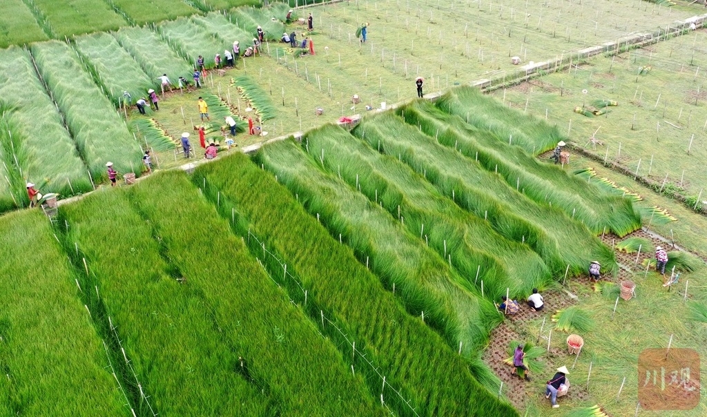 7月5日,眉山市东坡区尚义镇舒林村村民在地里忙着收割蔺草。眉山市东坡区是我国重要的蔺草种植基地,今年通过“公司+业主”订单,种草面积一万余亩。进入夏季,当地正抓紧时间组织收割,初加工后的蔺草将主要用于编织榻榻米、枕套、凉席、坐垫等家居用品和室内饰品。据了解,眉山市东坡区生产的蔺草产品深受海内外市场青睐,已成为当地出口创汇和农民增收致富的大产业。