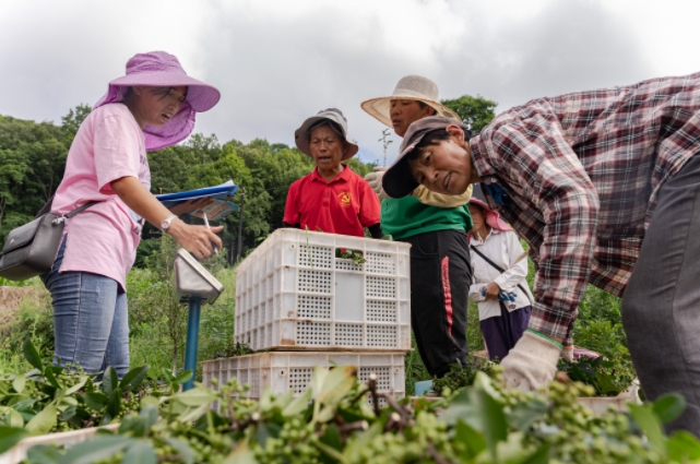 “之前是9.7公斤,这里有19公斤!”上午大约10点,临工王成兰将一筐鲜椒搬到路边过称,青花椒主题公园的出纳翻到她的名字,记录下数据。