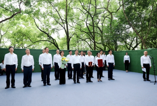 7月6日,岳池县。“七一勋章”获得者柴云振墓碑前,柴云振的儿子柴兵荣双手捧着“七一勋章”、孙女柴萍怀抱“七一勋章”证书、女儿柴昌英手持献花,一步一步上前,将“七一勋章”摆放在柴云振墓前。