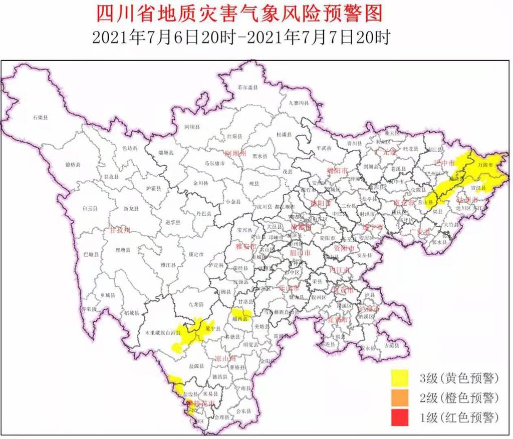 7月6日,四川省地质灾害指挥部办公室结合四川省气象台天气预报情况,发布地灾黄色预警:7月6日20时至7月7日20时,巴中、达州、南充、攀枝花、甘孜、凉山等市州的18个县(市、区)进入预警范围,预警区域较前一天减少。