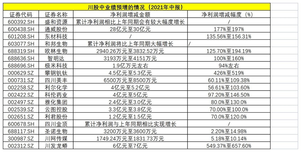 记者统计显示,在已经发布半年业绩预告的31家上市川企中,“报喜”的有23家,其中有15家预增,3家略增,5家扭亏。