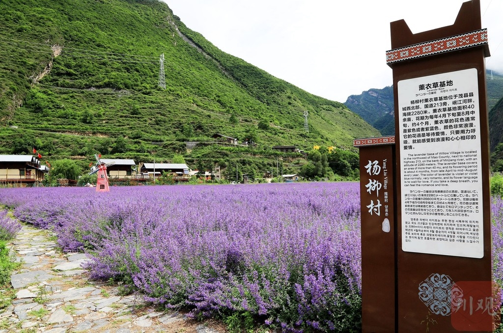 茂县叠溪镇杨柳村距茂县县城68公里,是具有浓郁羌民族特色的典型村寨,又是羌族多声部的发源地之一,2019年被评为国家级AAA景区。2017年,杨柳村开始试种薰衣草,面积越来越多,每年4月底开花,花期长达5个月。