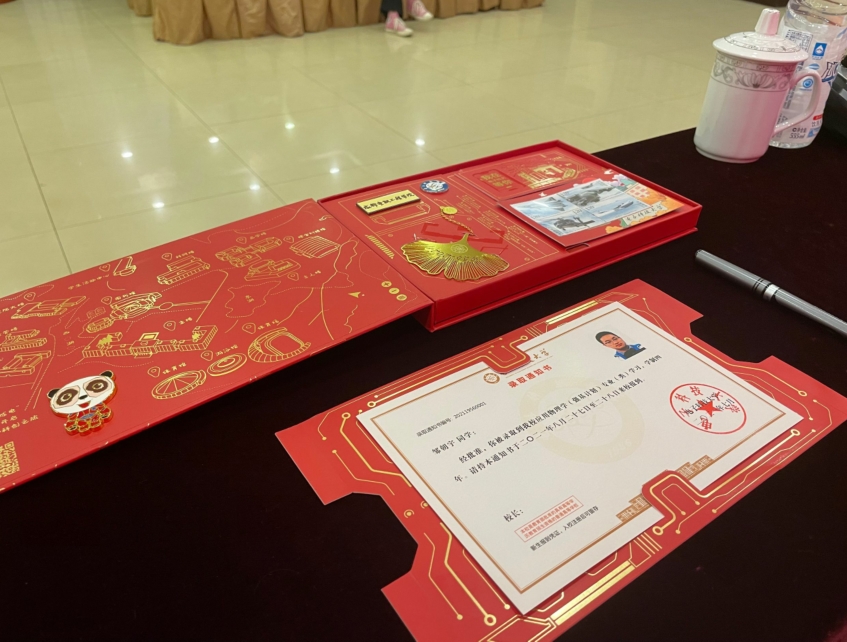 记者了解到,这封录取通知书处处“暗藏玄机”,不仅打造了定制EMS专递塑封包装,通知书礼盒更是兼具实用性和收藏性,“彩蛋”满满:带有芯片图案元素的录取通知书、熊猫形象金属磁吸徽章、校园VR地图、校徽…