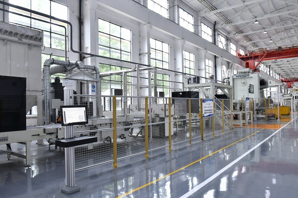 偌大的生产现场空无一人,单臂机器人、自动导航运输车来来回回,从原料上料、冲压成型,到清洗去毛刺、刷漆烘干,再到成品下料入库,都由智能控制系统、机台自动化生产、AGV自动化转运、机器人自动叠片等自动化设备全线集成……