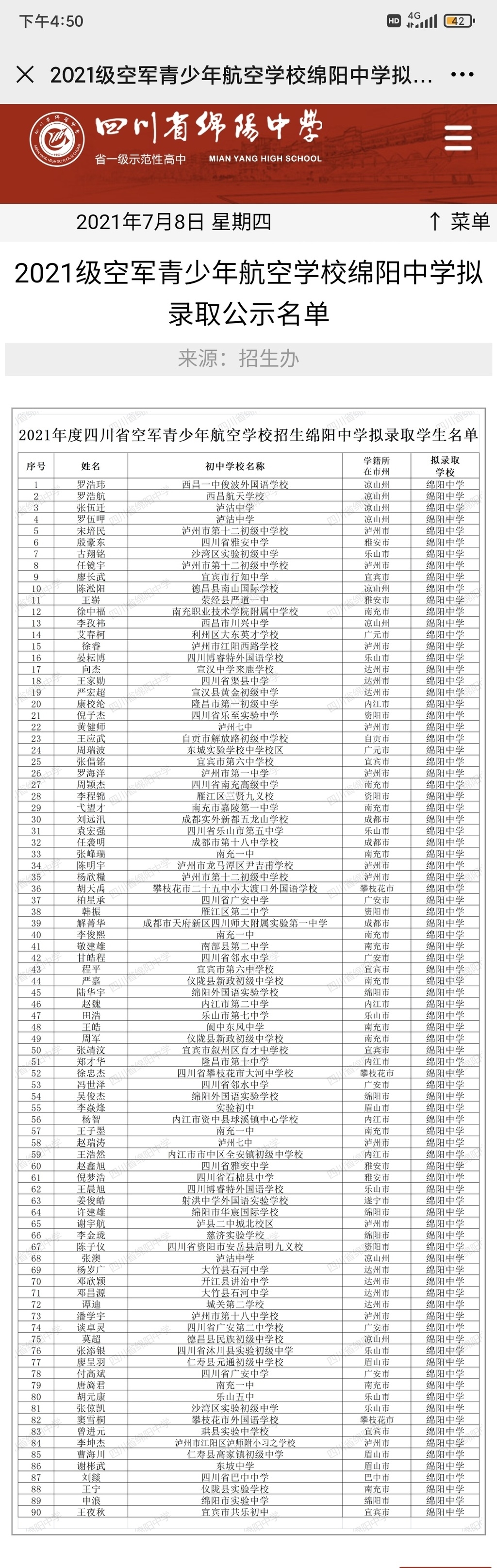 近日,绵阳中学发布2021年度四川省空军青少年航空学校招生绵阳中学拟录取学生名单,罗浩玮、罗浩航、张伍迁、罗伍呷等90名同学拟被该校录取。