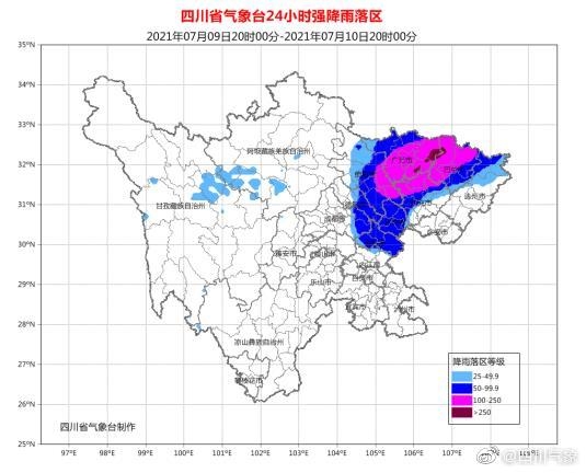 四川省气象台7月9日16时00分发布暴雨黄色预警:9日20时到10日20时,广元、绵阳、巴中、南充、遂宁、资阳6市和德阳、成都2市东部及达州北部的部分地方有暴雨(雨量50~80毫米),其中广元、巴中2市和绵阳东部、南充西部有大暴雨(雨量100~150毫米),个别地方雨量可达250毫米以上。甘孜州东北部和阿坝州西南部有大雨到暴雨(20-40毫米)。