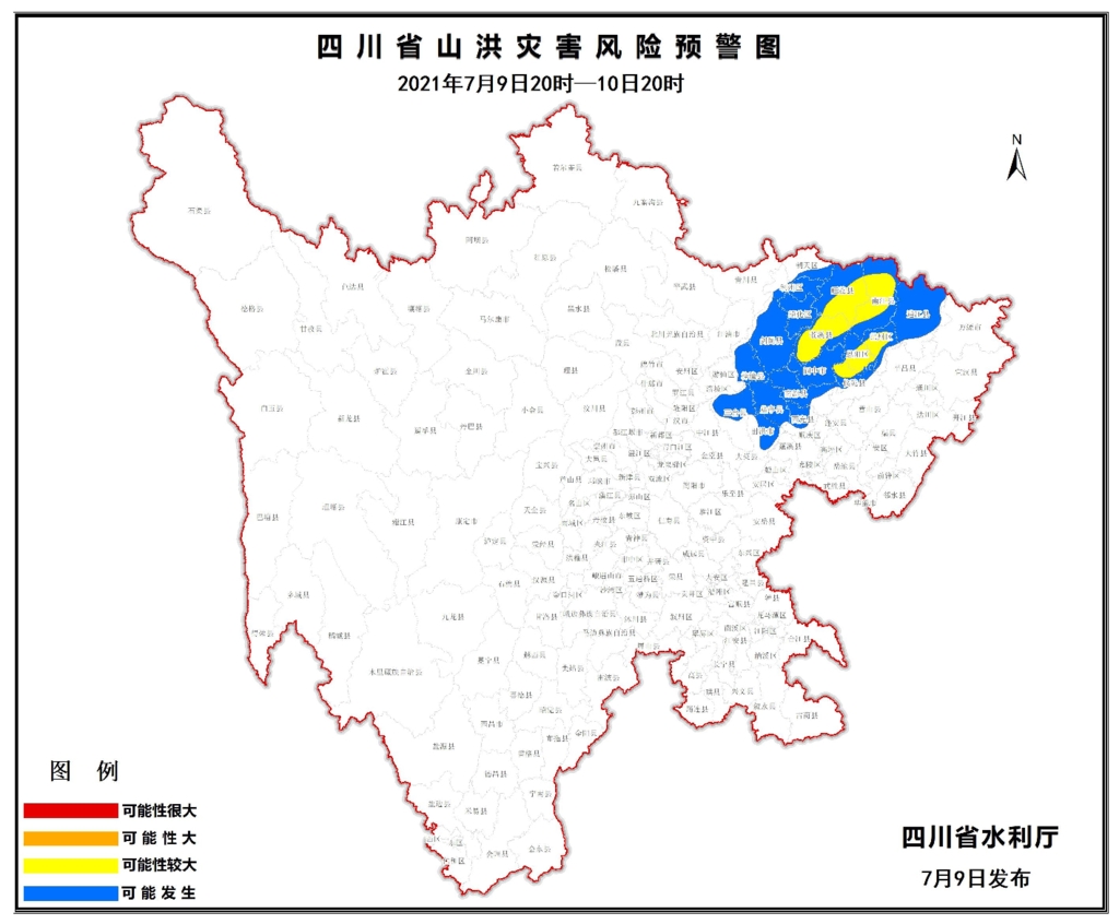 预警显示,7月9日20时至10日20时,南江、恩阳、巴州、旺苍、苍溪、阆中、仪陇等县(市、区)发生山洪灾害可能性较大(黄色);盐亭、三台、梓潼、射洪、通江、昭化、剑阁、利州、西充、南部等县(市、区)可能发生山洪灾害(蓝色)。