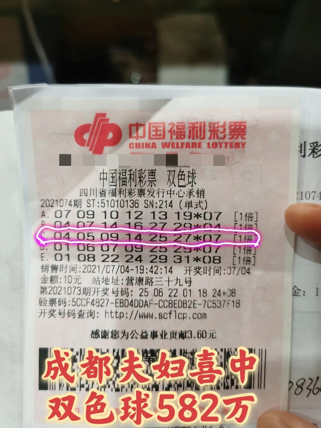 记者7月9日从四川省福彩中心获悉,7月4日晚,中国福利彩票双色球第2021074期开奖,全国共中出14注一等奖,其中四川1注,花落成都市金牛区营康路39号站点。据检索,我省中奖票为一张10元的自选号码单式票,奖金582万元。