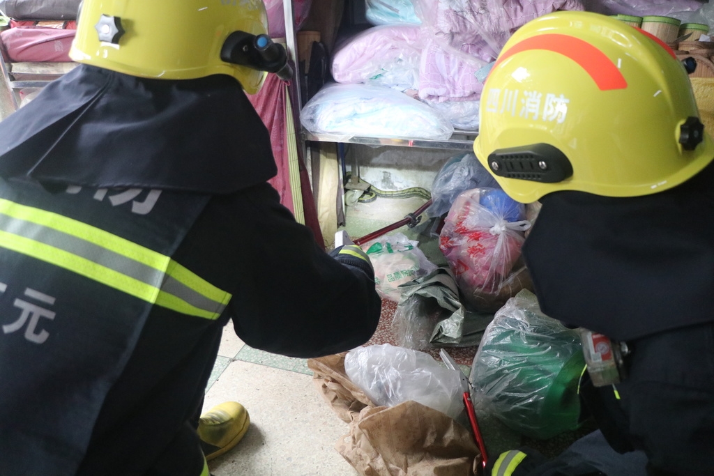 7月8日,广元119指挥中心接到报警称:旺苍县东河镇老城郊市场内一商铺发现一条大蛇,居民备受惊扰,不敢贸然出入,请求消防处置。接报后,指挥中心立即调派旺苍兴旺大道消防救援站1车5人赶赴现场进行处置。