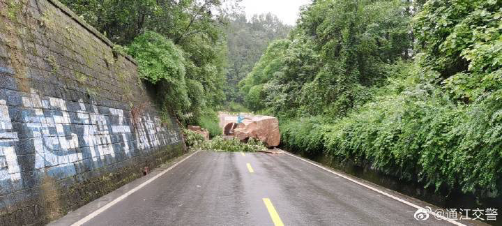 通江县辖区也由于强降雨,通江县国道G347+2128KM(小地名:木兰山隧道口)处,山体落石,道路中断,暂无法通行。
