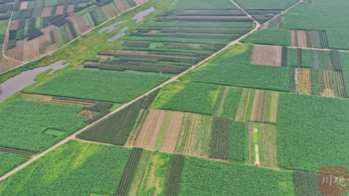 7月9日,记者在四川省南充市嘉陵区河西镇、一立镇等地的蔬菜产业基地高空俯拍看到,蔬菜产业基地内道路纵横交错、菜地整齐划一,一块块绿意盎然、充满生机的农田交织延伸,犹如一幅色彩浓墨的“水彩画”。
