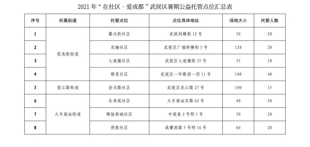 “活动的目的,是为了更好满足武侯人对幸福美好生活的新向往,推进’我为群众办实事’实践活动落地落实落细,推动形成青年参与社区共建共治共享发展的新格局。”武侯区相关部门工作人员介绍,暑期公益托管志愿服务活动将按照“团干+社工+志愿者”模式,以社区、学校、企业等为单位,提供场地、教学设备、整合各类资源开展2021年武侯区暑期公益托管活动,切实解决双职工家庭、部分特殊困难家庭暑假期间孩子无人照看等问题。