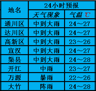 今天晚上到明天白天,达州南部中到大雨;北部大到暴雨,部分地方大暴雨。最低温度:22~24℃,最高温度:26~28℃。