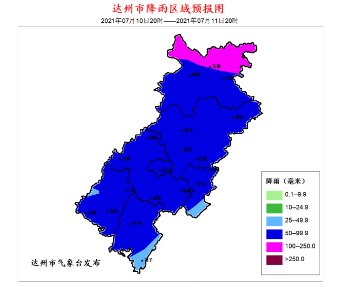7月10日8时,达州市气象台发布暴雨蓝色预警:预计10日白天到11日晚上,达州陆续出现强降雨,宣汉、达川区、通川区、渠县、大竹、开江有大到暴雨(30-80毫米),万源有暴雨到大暴雨(50-120毫米),个别地方可能超过150毫米,最大小时雨强30~60毫米;过程中伴有短时强降水、雷电、阵性大风等强对流天气。