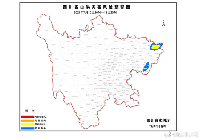 7月10日17时,四川省水利厅发布山洪灾害蓝色预警,10 日 20 时至 11 日 20 时,通江、万源等县 (市、区)发生山洪灾害可能性较大(黄色);平昌、大竹、 渠县、华蓥、邻水、前锋等县(市、区)可能发生山洪灾害(蓝色)。