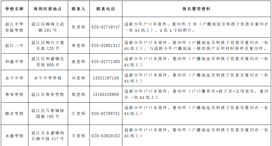 温江区公民办学校实行一体化管理,报名时间保持同步,请适龄少年家长于7月16日(周五)到校报到注册。