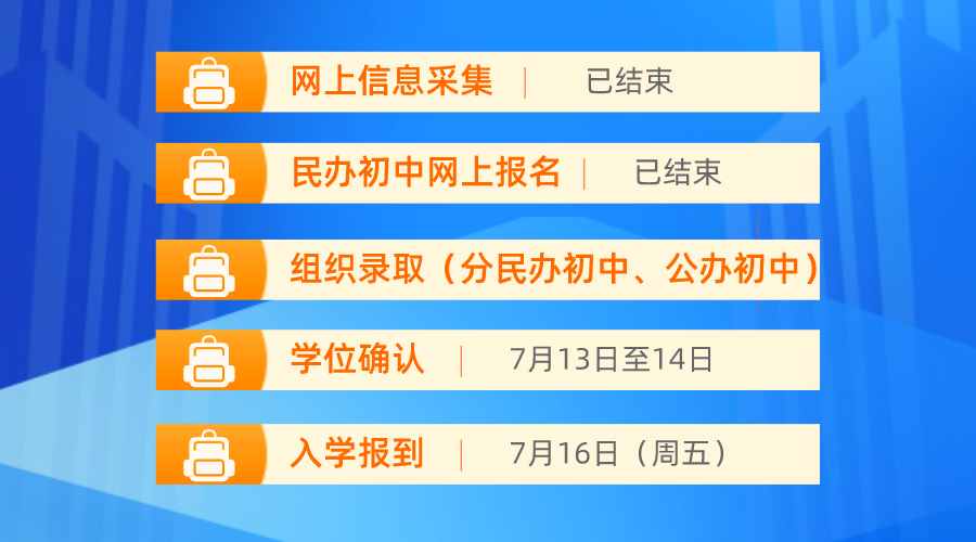 2021年9月就读公办初中一年级的本地户籍适龄少年,请于7月13日-7月14日登录“成都市义务教育招生入学服务平台”进行学位确认,于7月16日到校报到注册。