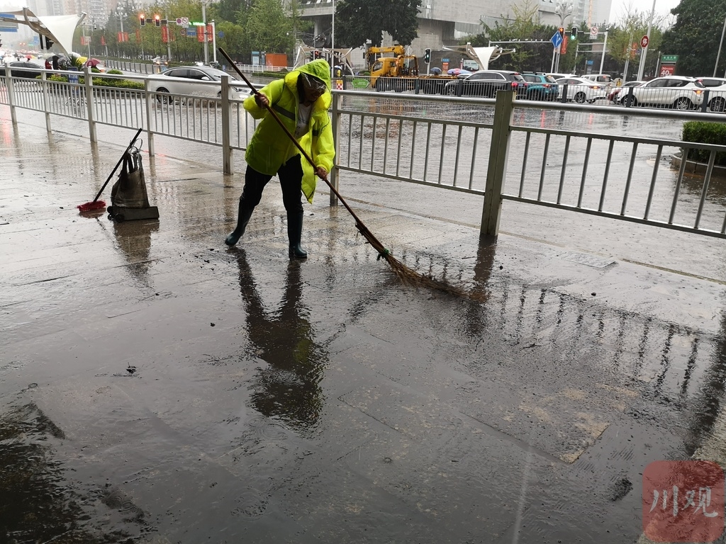 在广电路口,路边低洼处有积水,水深淹到脚小腿位置。在路肩,有清洁工正在清扫淤泥,她告诉记者,趁着雨水容易清扫淤泥。